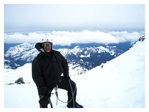 We finally made it to camp Muir and collapsed onto the three tiered glorified storage shelves that would serve as our home for the next two days. We had plenty of company as the group that was to have left could not due to the weather so we became quite friendly. I found myself laughing since every time someone would open the door for any reason the wind and snow would come pouring in on the dirt floor. The reason I was laughing is that no one complained since the internal temperature of the hut was a balmy 37 degrees! So we helped the couple of troopers from the trip, especially Bobbi who is really an overcomer, who were hurting the most to get warm and then we crashed for about 12 hours.